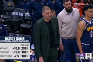 约老师缺阵后 掘金场均篮板减少10个 场均内线得分减少15.4分 场均二次进攻得分减少7.5分