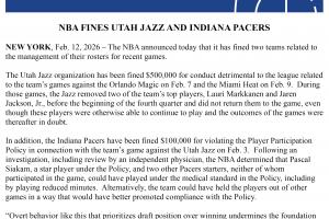 体育资讯02月13日讯 💥重罚!官方:爵士因轮休马卡/JJJ被罚50万美元 步行者被罚10万