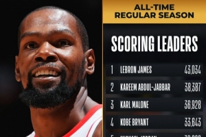 火箭球星杜兰特三分命中后拿到个人生涯第32000分,依然排名历史得分榜第6分,距身前的乔丹还差292分。