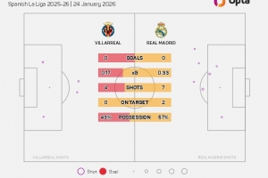 据Opta统计,此役上半场比利亚雷亚尔射门4次、射正0次,据Opta统计,皇马是2026年五大联赛唯一上半场还没有被对手射正过的球队。