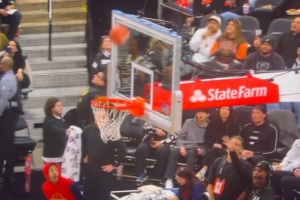 GIF-马刺球迷半场超远 打计时器命中拿走1万美元